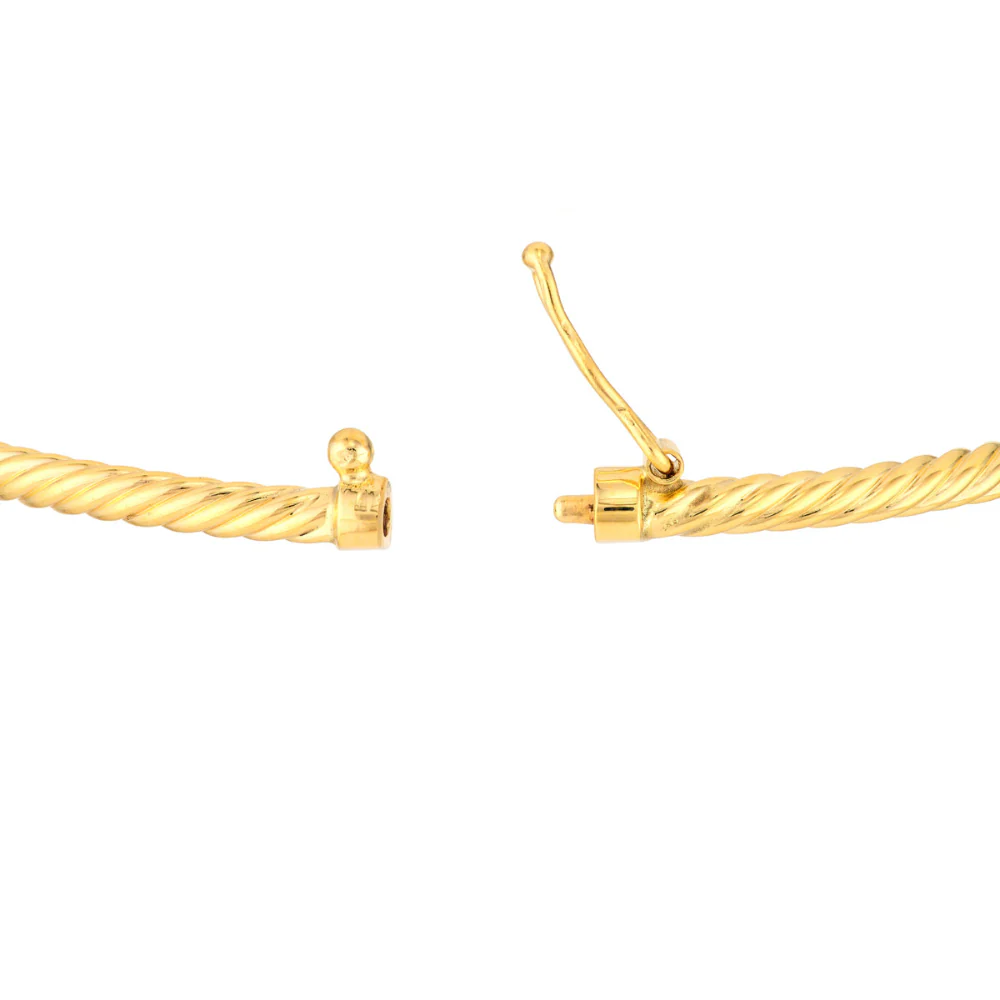 14 karat gold corrugated ridged design bangle bracelet with a hinged opening and safety clasp.