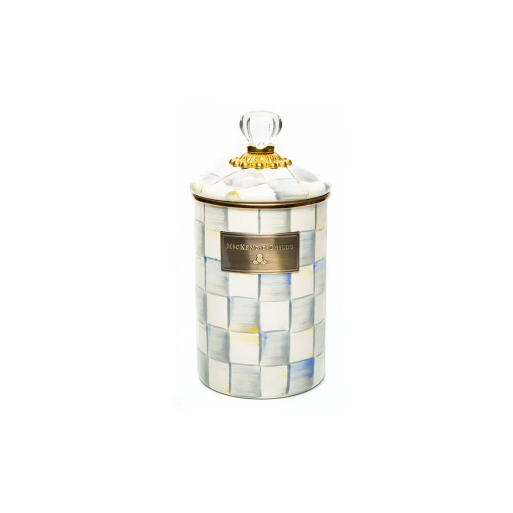 Pantry staples—flour, sugar, and coffee—might seem the most obvious of contents with which to fill a Sterling Check Enamel Canister, but the possibilities are endless! Keep it in the kitchen with coffee beans and tea bags, cookies and candies, or dog biscuits and birdseed—or invent new uses around the house. Each enameled steel canister is hand-painted with color-dragged checks in subtle shades of grey and topped with an elegant clear glass knob.