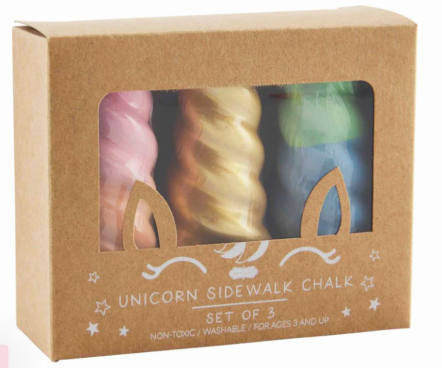 Let's chalk about how great this Unicorn Horn Chalk set is. The set comes with three unicorn horn shaped washable sidewalk chalk. The chalk features bright colors for your little ones, including pink, gold, green, blue, orange and yellow. This chalk is intended for children ages 3 or older.