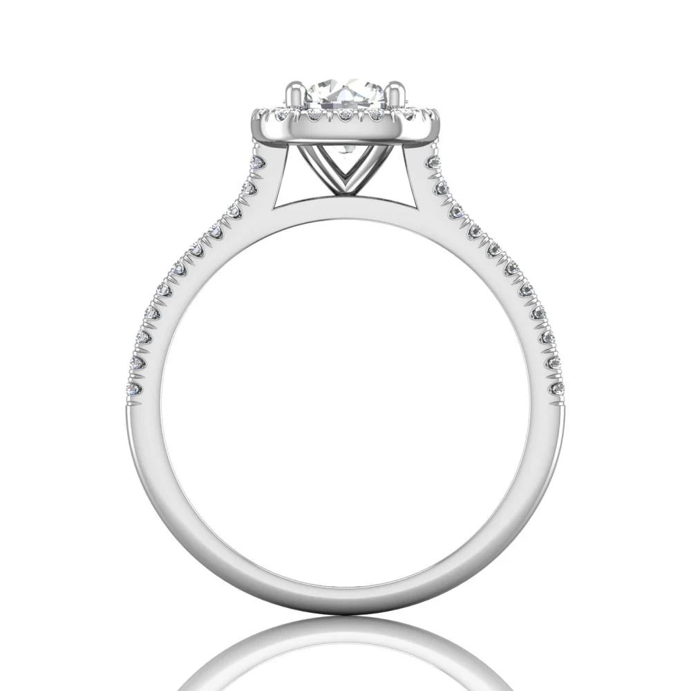Classically elegant and timeless in design, this FlyerFit halo engagement ring sparkles from the cutdown micropavé diamonds adorning the band as well as the cushion halo and round center diamond.