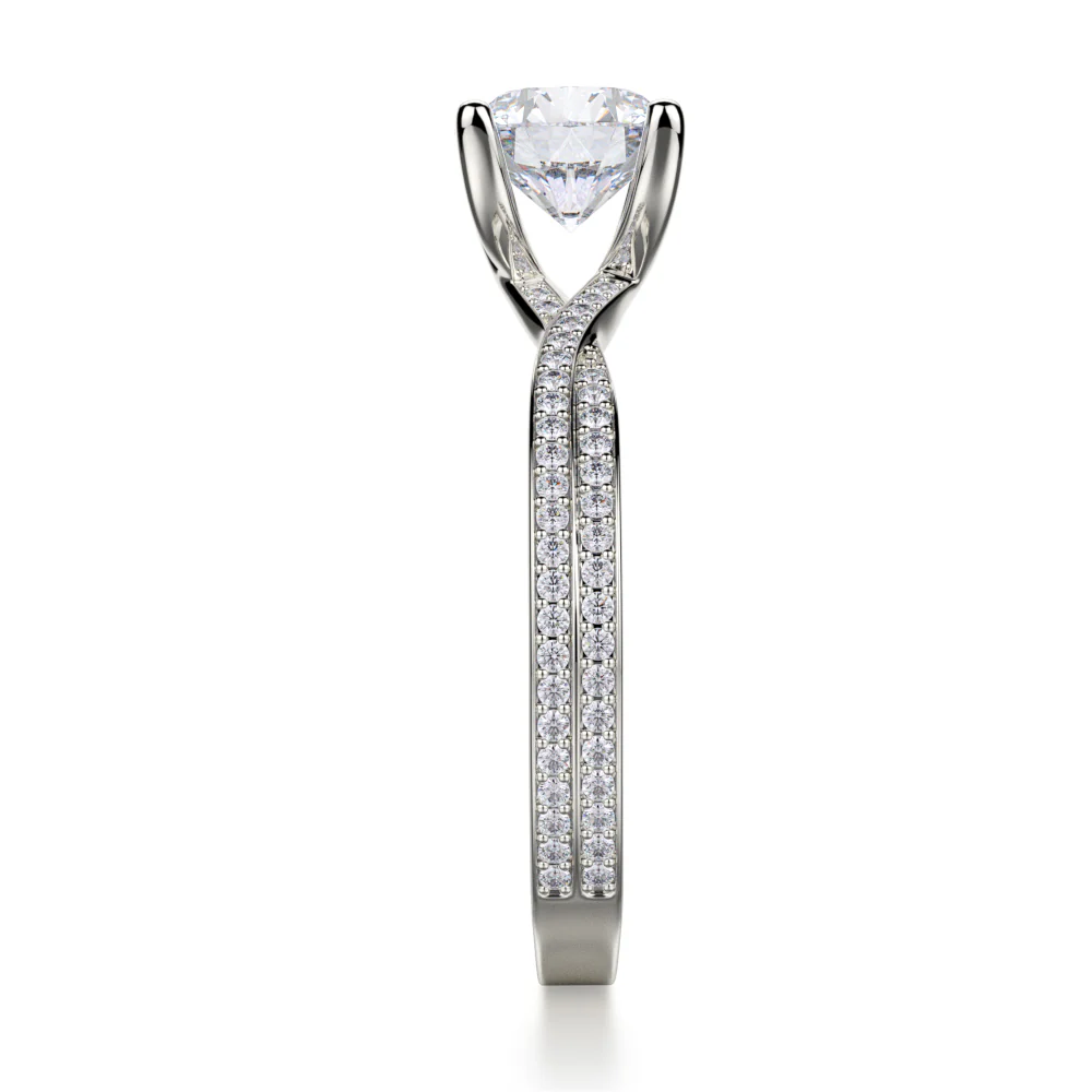 This immaculate Michael M engagement ring is displayed with a stunning round shaped center diamond (not included at time of purchase), and can fit an array of diamonds ranging in size from 0.90 carats to 1.10 carats. It is immaculately adorned with over 0.20 carats total weight of breathtaking round cut side diamonds.